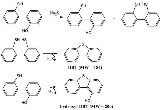 28]. On the basis of this result, it is speculated that thiophenol can produce DBT too under mild conditions in the presence of alkalis. Since this route is based on the catalyzed thermal degradation of phenol or thiophenol, it does not require external agents such as oxygen and elemental sulfur except the presence of inorganic salts which are ubiquitous or readily available in coals and oils [