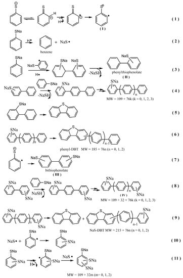 First, the homolysis of the NaSPh‒H bond generates an aryl radical anion (I) and a H• as shown in Reaction (1). The H• attacks the ipso-carbon bonding to –SNa yielding benzene as observed in the TGA-FTIR. Hydroarylation of thiophenolate by the aryl radical and the H radical followed by the elimination of NaSH produces a phenylthiophenolate (II), which subsequently undergoes more hydroarylation reactions to generate polyaromatics with MW = 109 + 76 k (k = 0, 1, 2, 3) as detected in the Q-TOF. Phenylthiophenolate can also cyclize to DBT which is discovered in the gas phase while a cyclization of phenyl substituted phenylthiophenolate readily generates phenyl substituted DBT (phenyl-DBT), which appears at MW = 185 + 76 n (n = 0, 1, 2) in the Q-TOF positive mode.