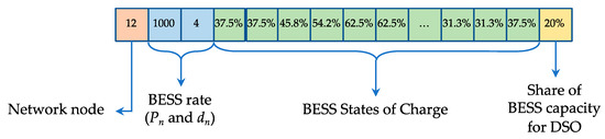 The traditional binary coding makes the GAs particularly suitable for solving sizing and siting problems of different resources, like (for power distribution systems) capacitors, distributed generators, or BESS. However, in the case of storage devices, the effectiveness of their support to network operation depends also on their hourly state of charge (SoC). Therefore, the solution coding has to represent the BESS daily scheduling as well, so that the NSGA-II can optimize the design and normal operation of storage devices simultaneously, finding full compromise solutions among different point of views. Furthermore, as it is explained in the next paragraph, part of the BESS capacity is reserved to DSO for local distribution network support. Consequently, also this capacity share has to be included among the chromosome information of the generic solution. An example of the solution coding referred to a single BESS is reported in Figure 1. The whole chromosome of a generic individual is obtained by repeating this schema for a prefixed maximum number of BESS (NBESS).