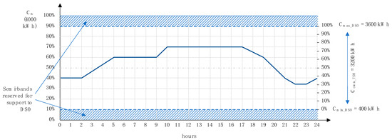 It establishes the rate of the “virtual storage” for DSO. From this value (CDSO), expressed as a percentage of Cn, the upper and lower semi-bands of capacity are calculated (Cmin_DSO = CDSO/2; Cmax_DSO = Cn − CDSO/2) and always reserved to DSO in order to guarantee in any moment the availability of the virtual storage capacity in case of contingencies that could bring the distribution system to a critical emergency configuration (Figure 2). The residual capacity, Cown_TSO = Cn − CDSO, is managed by the private owner for energy trading and for offering ancillary services to TSO. The maximum available power of the virtual storage (Pmax_DSO) may change hour by hour because it depends on the current SoC. If it is around half of Cn, it is reasonable the potential exploitation of the highest value (Pmax_DSO = CDSO/Δt, with Pmax_DSO ≤ Pn), while when the SoC is coincident to the lower or upper bound (Cmin_DSO or Cmax_DSO), the maximum available power takes its lowest value (Pmax_DSO = CDSO/2Δt, with Pmax_DSO ≤ Pn). Again, for this gene, the value is a real number within the interval [0%, 100%].