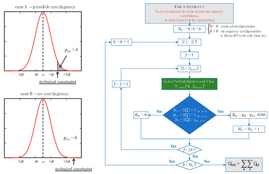 An explicit and detailed assessment of the annual risk to violate technical constraints in a given distribution network requires probabilistic load flow (PLF) calculations, solved for each time step of the typical days used to represent the yearly behavior of distribution network customers [30]. The load/generation behavior in each hour has been assumed normally distributed. The risk assessment procedure starts with the definition of the impedance matrix [Z]b, relative to the bth network configuration in the N-1 security analysis (where b = 0 means the network in normal configuration and b > 0 means the network reconfigured without the bth element), and the acquisition of the nodal current matrix [Inode]f in the fth hour of the typical daily profile. The results of the PLF are the nodal voltage [Vnode]f and the branch current [Ibranch]f matrixes (expressed in terms of mean value, μ, and standard deviation, σ, of a normal distribution), by which the probability (ptcv) to overcome the voltage regulation band or the conductor thermal limit is estimated. Only the Nc operating conditions with non-negligible probability to violate the technical constraints (ptcv > 0) are stored (Figure 3—case A), while the cases on which the extremes values of [Vnode]f and [Ibranch]f (assumed equal to μ ± 3σ) do not exceed the technical limits (minimum and maximum nodal voltages, Vlim_min and Vlim_max, and maximum branch current, Ilim_max) are disregarded (Figure 3—case B).