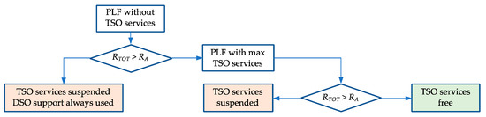 In order to assess these network limitations, the following procedure has been implemented. In normal operating conditions (Figure 4), for each hour of the typical day, a first probabilistic load flow (PLF) is executed without considering the provision of TSO ancillary services (but with the BESS typical scheduling). If the risk of technical constraints violation is greater than the acceptable one (RTOT > RA), the TSO ancillary services are suspended, and the virtual battery reserved to DSO is systematically used to solve or limit the network contingencies. In the other case, two additional PLFs are solved, by assuming that all the BESS installed are generating/absorbing their nominal powers simultaneously. If RTOT ≤ RA, the TSO ancillary services can be freely provided, limited only by the respect of the DSO semi-bands and by the power exchanged for arbitrage (BESS scheduling). Otherwise, the TSO ancillary services are suspended again. To simplify the analysis, it has not been calculated the maximum amount of TSO services that can be provided without causing any network contingency. Still, the verification of technical constraints is always performed assuming the full provision of the available flexibility.