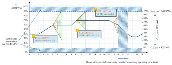 The second case (10th hour of the day) considers the presence of the virtual battery dedicated to the DSO. The SoC is still constant (PfBESS = 0). However, the proximity of the upper bound limits the available regulation semi-band to ΔPf = (Cmax_DSO − SoC10)/Δt = (3600 − 2800)/1 = 800 kW (<Pn). Thus, the flexibility for FCR is ±267 kW, while the flexibility for aFRR should be ±533 kW. However, because secondary control has to be guaranteed for 2 h, this flexibility is further reduced to ΔPfaFRR = (Cmax_DSO − SoC10)/ΔtaFRR = (3600 − 2800)/2 = 400 kW.