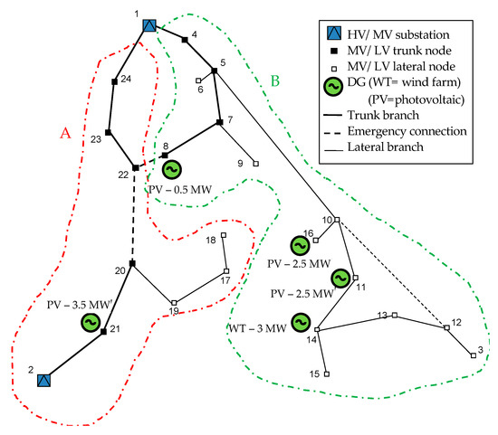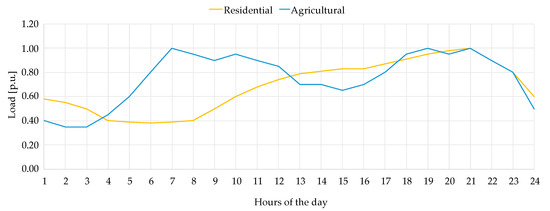 In the following the main parameters of the test network shown in Figure 6 are provided. Table A1 reports the main information of the lines (starting end and finish end, line length and line type) and the conductor parameters (cross section, resistance, reactance, capacitance, rated current). In Table A2 e in Table A3, respectively, the data about loads and generators are listed (node location, rated power, power factor (P.F.), and load/generator type). Loads are characterized by the daily load profiles shown in Figure 7. Generation is represented with representative production profiles according to the type of source.
