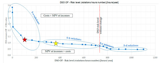 In the MO formulation, the DSO’s objective function (OF) has been defined as the annual risk to violate any technical constraints (to be minimized), whereas for the BESS owners the OF is the cost/benefit ratio (to be minimized as well).