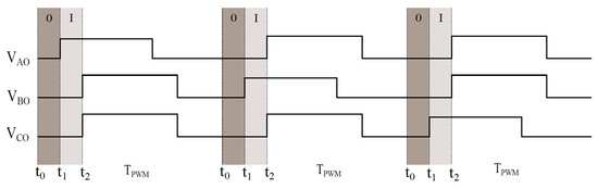 is the time instant in which the PWM state excitation is switching referred to the phase , is the power DC-line voltage, is the star-point voltage referred to the virtual star-point and is a vector that is expressed as follows:
