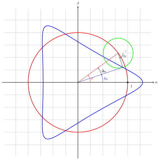 Plain representation of the DFC signals: and respectively on the and axis (blue line). The red circle represents the signals for the case and is taken as reference. The green circle with radius p represents the term related to and (for this case ).