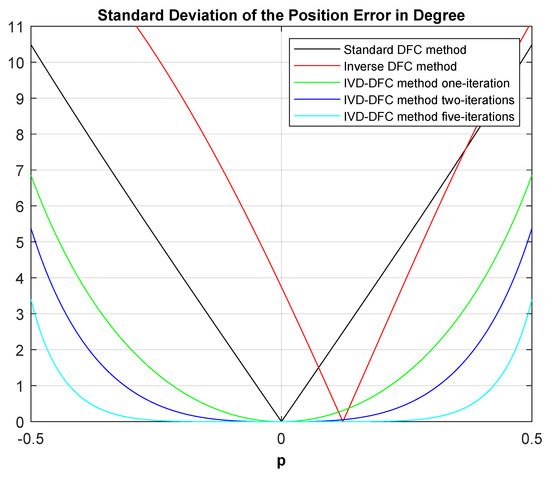 Comparison of the position standard deviation errors of the presented methods. The plot is referred to a machine with the following inductance values: µH, µH, µH. The parameter is let vary between and in order to get the p range between and .
