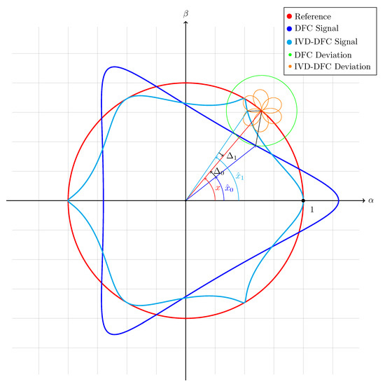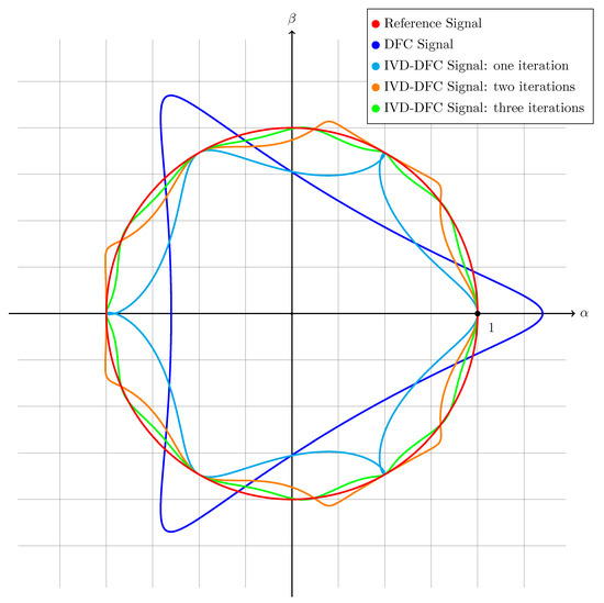 Within this subsection the measured DFC signals are compared to the IVD-DFC ones when the motor is operating at nominal speed without external load torque applied on the shaft. The saliency effects of the examined motor are not considerably large and a single iteration is enough to eliminate almost entirely their component. As shown in Figure 14, the DFC signals and are forming a circular 2-D plot where the saliency component can easily be seen compared to the reference circle in black, that represent the ideal case with no multiple harmonics.