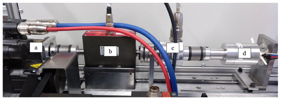 Workbench used for the experiments. (a) Servo motor for the generation of external load torque. (b) Load torque sensor. (c) Encoder. (d) PMSM under test.