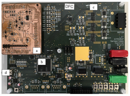Electronic board used for the drive, control and measurement of the PMSM. (a) Board extension with DFC electronic for the measurement of the star-point. (b) STM32H7 microcontroller. (c) Three-phase inverter and current sensors. (d) USB port for external communication and data transfer.