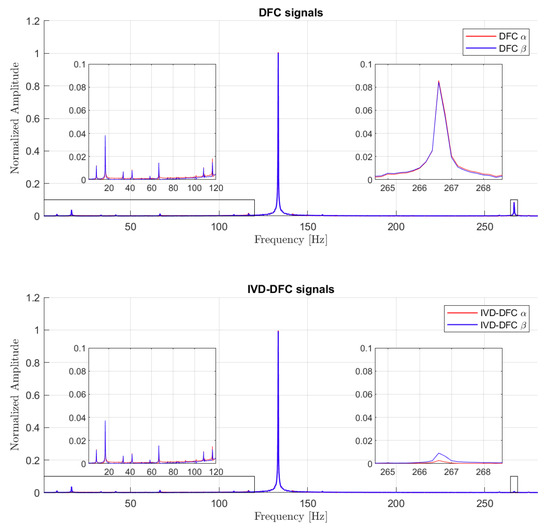 As shown, two amplitude peaks are prevalent among the whole frequency spectrum. They represent respectively the first and the second saliency harmonics. The peak of the second harmonic is reduced using the IVD-DFC about more than 80% of the original value. The FFT shows small amplitude harmonics before the first peaks. We suppose that these subharmonics are responsible for the imperfect estimation of the angular position (see the thickness of the signals in Figure 14).