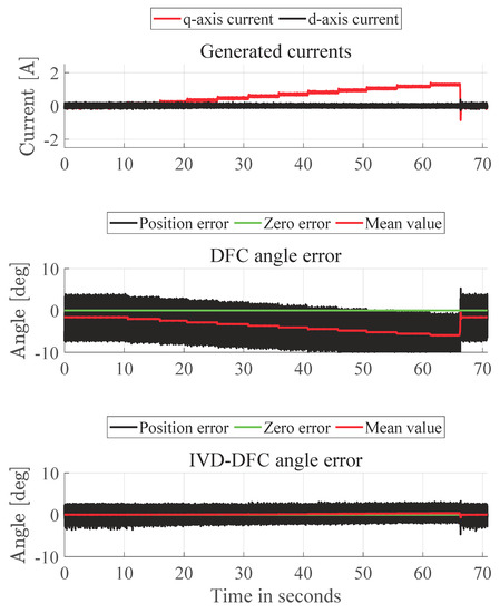 Current steps with increasing amplitude are generated on the q-axis of the motor when the external servo-motor drives the PMSM at 300 RPM. The electrical angle error of the DFC algorithm is compared with the IVD-DFC one.