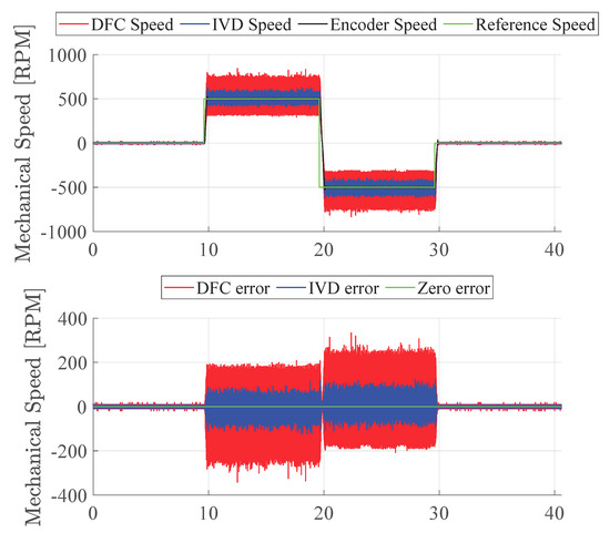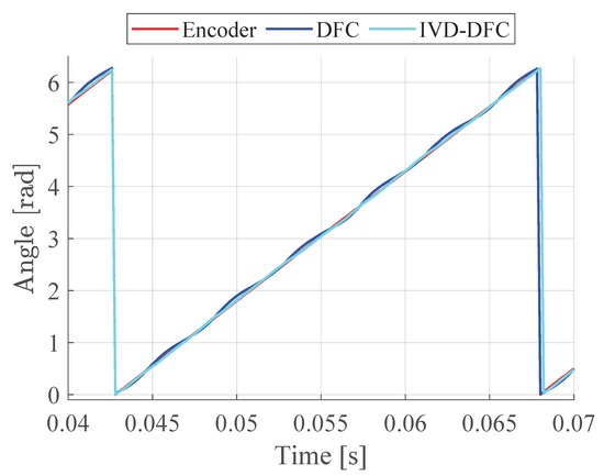In the previous subsection, we focused on the obtained and signals and we proved the functioning of the IVD-DFC algorithm. Within this subsection, we present the comparison between the encoder information and the estimated angular position and speed using DFC and IVD-DFC.