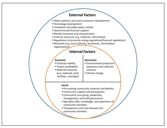 Factors affecting the success of community energy projects can be internal as well as external. Internal factors are those within a community; external factors are based in the wider socioeconomic and political contexts [3]. A similar categorization was adopted by Goedkoop and Devine-Wright (2016) in their discussion of shared-ownership renewable-energy projects. They used “micro” level to refer to factors residing within a project, such as trust, project expectations, coordinated negotiations, sufficient time and stakeholder engagement. These micro factors were both influenced by and an influence upon the “macro” context of national policies, institutions and norms [22]. While studying individual energy community cases, some researchers have further analyzed internal factors based on three dimensions: economic (e.g., financial benefits), normative (e.g., environmental protection) and social (e.g., uncertainty and trust) [23,24].