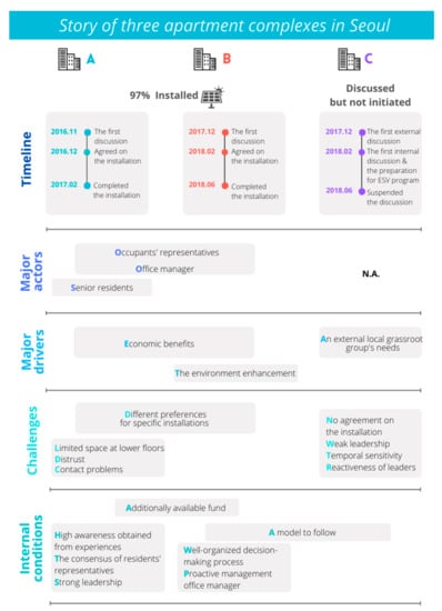 By comparing the successful cases and the suspended case as seen in Figure 3, this study noted the importance of leadership. Leadership, especially the leadership of the office manager, facilitated the process of collective installation based on the concrete trust built from past energy-related achievements in the successful cases (Complexes A and B). Because the office manager was a full-time employee of the complex, the manager’s initiative and contribution played a key role. In addition, the leadership responded appropriately to unforeseen challenges, particularly concerns about the potential advantages and disadvantages of the project.