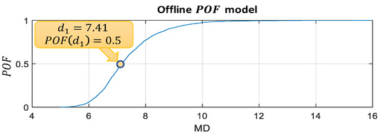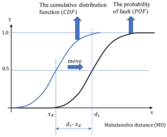 The offline model was presented in Figure 15. As can be seen, the was 0.5 when MD value equaled the fault detection threshold . When MD value was lower than , the value was lower than 0.5. When MD value was higher than , the was higher than 0.5 and could increase to 1. This result was in accordance with the model designed in Section 2.1.2.