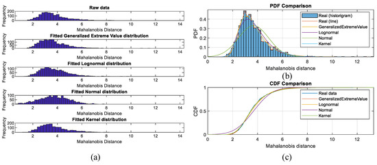 In the offline phase, the model was developed, with the system wide feature (the Mahalanobis distance ) on the x-axis, against the values on the y-axis. By applying the selected kernel distribution into Equation (7), can be calculated as .