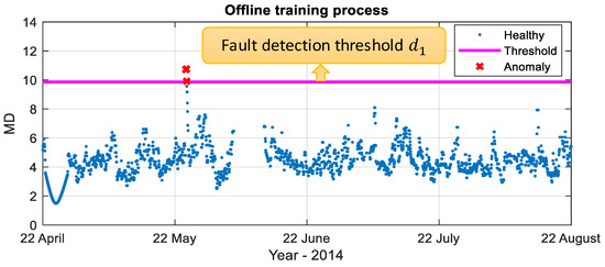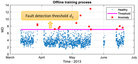 where is the fault detection threshold for the fault detection model that were calculated during training stage using Equation (4). is the Mahalanobis distance in Equation (3).