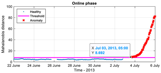 where is the MD at online monitoring stage. is the fault detection threshold presented in MD, and the value of is given in Equation (4). is the Mahalanobis distance calculated by Equation (7).