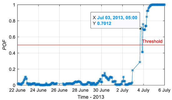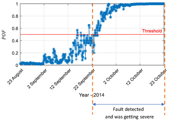 The risk calculation has two parts: and calculation. The of the industrial compressor for the online phase is shown in Figure 17. The fault detection threshold was 0.5. The fault detected time using value was 22 September 2014, which was consistent with that using MD value in Figure 16.