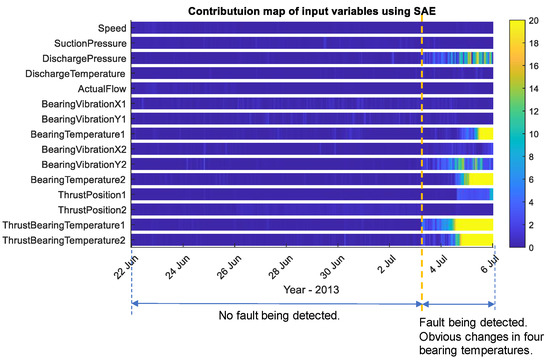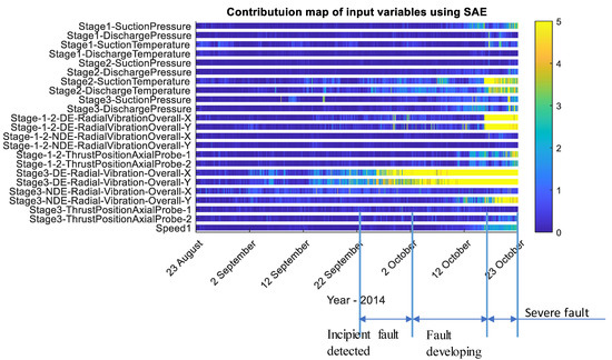 The two-dimensional Q statistic contribution map in Figure 18 shows the contribution of each input variable to the detected anomaly. The figure clearly shows that stage 3 DE bearings’ measurements mainly contributed to the increase of the MD value.