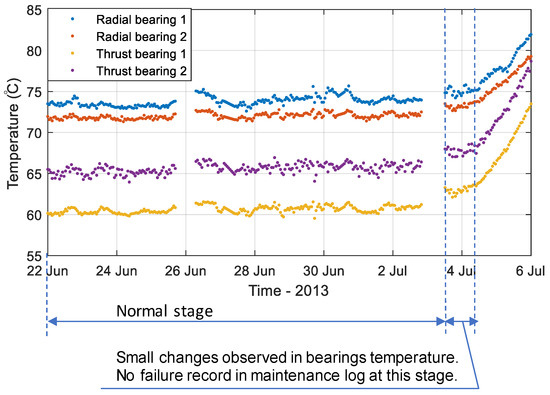 In this case, the health indicator detected the fault during 22 September to 2 October 2014. Compared to the measured variables obtained from the compressor’s condition monitoring system in Figure 21, during this time, only slight changes appeared in the measurements of the compressor. This indicated that the health indicator successfully detected the fault at its incipient stage.