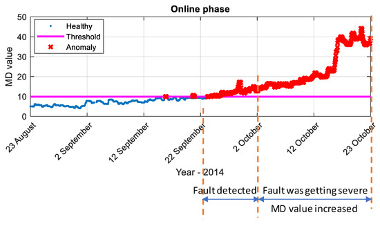 If no corrective action was taken after a fault being detected, the online MD value would exceed the shutdown threshold . The value of this threshold based on the acceptable criteria of the specific process system. Alternatively, according to [20], when not enough information is available, the shutdown threshold of a measurement can be defined as 4 times larger than its maximum operating value.