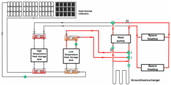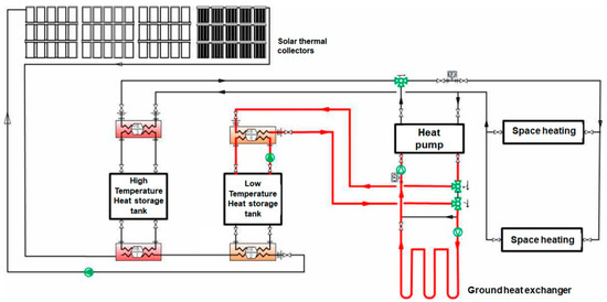 This system can be operated in three ways, as shown in Figure 2, Figure 3 and Figure 4. Figure 2 shows the typical existing GSHP operation mode. Figure 3 depicts the mode in which the collected solar heat is supplied to the heat pump through the low-temperature heat storage tank heat exchanger to supply the heating medium with a higher temperature to the heat source side of the GSHP. In this case, the temperature of the low-temperature (secondary) heat storage tank should be higher than that of the GHE; otherwise, the system will operate in the existing geothermal heat pump mode. Figure 4 depicts the operation mode in which solar heat is supplied to and stored in the ground as a seasonal borehole thermal energy storage system. In the absence of any demand for the collected solar heat and operation of the heat pump for cooling, such as in the pre-winter months, the heat collected by the solar thermal system is supplied to the underground space through the GHE. This improves the heat exchange efficiency of the geothermal source system during soil thermal imbalances.