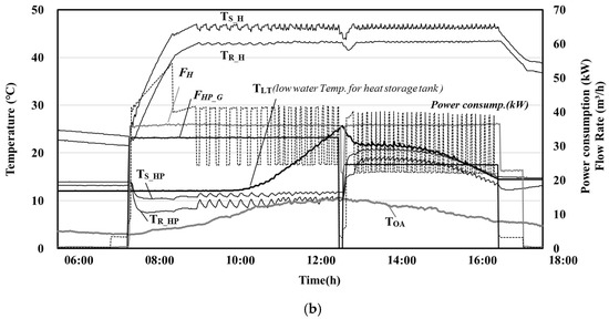 In the GSHP-only system (Figure 5a), the maximum temperature of the heat pump supply water at the heat source side was initially 13.1 °C but rapidly decreased to 11.4 °C during operation. The supply water temperature for heating at the demand side was maintained at approximately 45 °C, which is the set value.