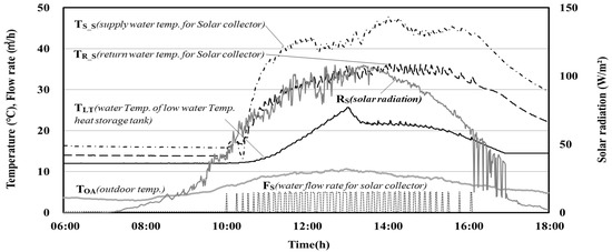 Figure 6 shows the operation results of the solar thermal system on the analyzed day when the solar-assisted GSHP system operated. The changes in the solar collector inlet and outlet water temperatures, circulation flow rate, and temperatures of the high- and low-temperature solar heat storage tanks over time, were collected along with the solar radiation and outdoor temperatures. The combined system operation started at approximately 10:00 and ended at 16:00. The total and the maximum solar radiation of the analyzed day were 604.5 and 110 W/m2, respectively. The temperatures varied depending on the solar radiation, and the total amount of solar heat collected on that day was 1315.2 kWh. The amount of heat supplied to the heat pump from 13:06 when the water temperature of the solar heat storage tank exceeded 25 °C was 823.4 kWh. Approximately 63% of the collected solar heat was used as the heat source for the heat pump; this value corresponds to 38% of the total daily heating load.
