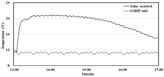Figure 7 shows the temperature variation of the supply water at the heat source side of the heat pump over time on the analyzed day when the geothermal and solar-assisted operations were performed. In the case of the GSHP-only operation, the supply water temperature was approximately 11.5 °C, while in the solar-assisted operation, the temperature to the heat pump ranged from 20.9 °C to 15 °C with an average of 18.1 °C during operation. The difference in the temperature between the geothermal-only and solar-assisted systems was 6.6 °C.