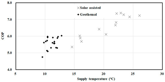 The COP variation with the supply temperature at the heat source side of the heat pump was analyzed; the COP of the heat pump almost linearly increased with an increase in the supply temperature. The COP of the heat pump ranged from 4.8 to 6.0 for the geothermal-only operation but improved to 5.4–7.4 for the solar-assisted operation.