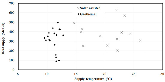 The supply temperature on the heat source side ranged from 9.5 to 12.8 °C in the case of the geothermal system operation in this study. In contrast, for the solar-assisted system operation, the temperature range was 14.6–26.1 °C.