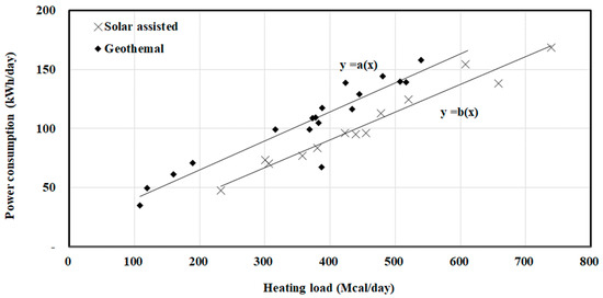Figure 11 shows the daily power consumption for the GSHP-only and solar-assisted GSHP operation conditions. For comparison, the daily power consumption was reviewed according to the heating load after 13:00, that is, when the daily solar heat connection operation was possible. As the daily heating load increased, the power consumption increased almost linearly, and the solar-assisted operation resulted in a lower power consumption than that in the case of the GSHP-only operation.