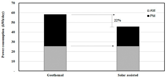 Figure 12 shows the comparison of the average daily power consumptions in the case of the geothermal-only and solar-assisted operation conditions. The power consumption includes the consumption by the heat and circulation pumps. The annual power consumption was 58,276 kWh for the geothermal-only operation and 45,661 kWh for the solar-assisted operation. As observed, the power consumption was reduced by about 22% in the coupled operation.