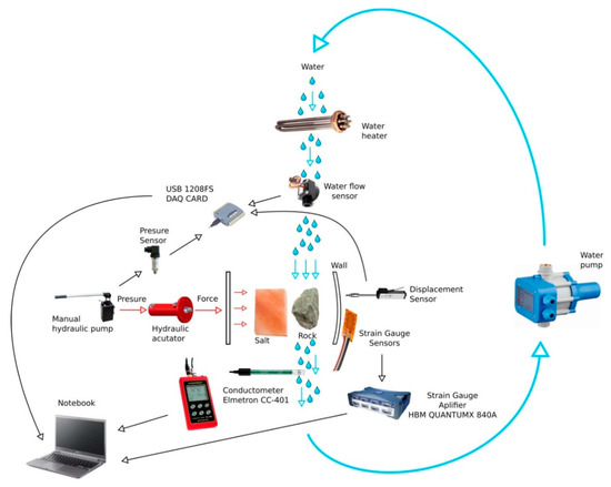 The examinations were conducted in the device described in detail in other studies [27,28]. The mechanism of work of the device for salt rock leaching, as well as information showing the flow between individual components, are shown in Figure 2. Water flow forced by a pump is marked in blue. Temperature was controlled via a heater installed in the container, whereas flow discharge was registered by a suitable sensor. The system for loading (pump with servomotor) and the main chamber filled with salt and aggregate are shown in the central part of Figure 2. Data from individual modules were registered by notebook via suitable connectors. Besides, data acquisition image recording with the use of a time-lapse camera was conducted.