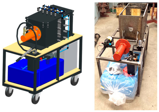 The testing compartment was made of a 12 mm thick steel sheet S355, and it was divided into open and closed parts. The closed part of the testing chamber is a sealed system equipped with a sleeve for hydraulic cylinder mounting. A hydraulic cylinder piston with a pressing plate puts pressure on the salt sample. The load is transmitted via the salt sample and aggregate onto the testing plate, where stresses and deformations are generated. Suitable values are measured by an extensometric converter and relocation transducer mounted at the measuring side of the testing chamber. Inflow and outflow valves allow control of the water flow direction and water discharge in the container. An overflow container with a capacity of 70 L allows water recirculation through the chamber–pumping unit–chamber system. A 3D model of the testing facility and a photograph of its compartments before assembly are shown in the picture below (Figure 3).