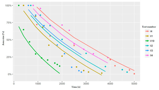 In the next stage, on the basis of collected data, the rate of salt tenon (salt bridge) development was modeled. Experiments were conducted for three different-sized samples. In the initial moment, T = 0 surface was equal to 1 (100%) and during the washing process it was reduced until its destruction. A linear regression model of numerous variables was used in modeling, where the percentage of the surface occupied by the salt tenon was an explained variable and explanatory variables were: water temperature, water discharge per hour and time of the analysis. The square root of time was taken because it improved model tailoring and better described the examined phenomenon. The effect is visualized in graphical form in Figure 5.