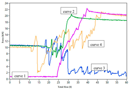 Test results from the measurements are shown in Figure 10. All samples were made from salt from the same location. The leaching water temperature was constant during all measurements (22 °C). It is observed in the diagram related to test II.5, that a small force value (about 16 kN) resulting from the stoppage of water flow and clamping force, caused the development of a large number of salt tenons and caused (threefold) elongation of the load relaxation time. Thus, we can conclude that the clamping force of the salt rock (directly and tightly) inserted into the shaft lining may cause retardation of the leaching process. The results of other samples’ tests confirm the correctness of the application of aggregate, used as an intermediate layer between the shaft lining and salt rock body.