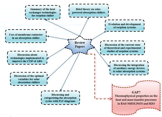 It is interesting to see that many authors have been discussing solar powered energy as an input source for absorption chillers [32,33,36]. Others aim towards the type of heat exchanger technologies on those systems [40] and the use of membrane contactor to enhance the absorption process [31]. Figure 1 presents the central paper reviews about absorption chillers presented in the scientific community in the last 10 years. Figure 1 shows no reviews about designing requirements for absorption chillers with the relevance of thermophysical properties in this process and the heat and mass transfer processes in the refrigeration absorption systems using ammonia/nitrate-lithium and water.