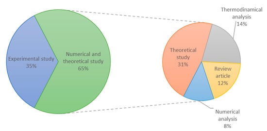 A critical analysis was carried out on the papers found in the literature review. The articles were examined by focusing on the following features: author and year of publication, methodology, goals, and significant findings. Figure 2 group the articles by categories. As can be noticed, 35% of the studies were experimental and 65% numerical and theoretical studies.