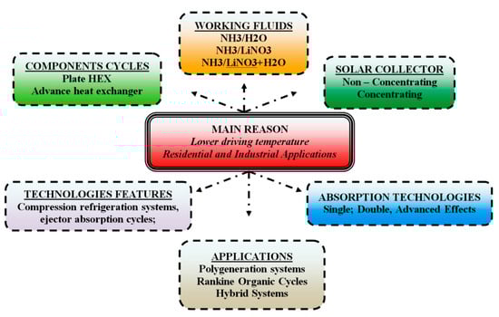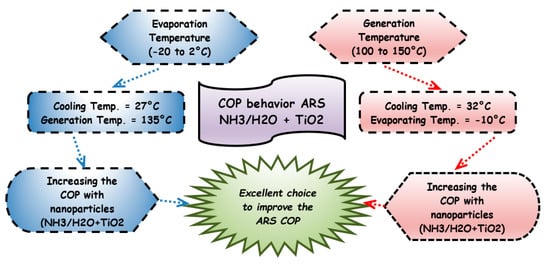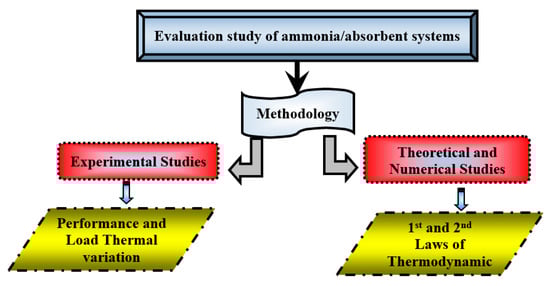 The First and Second Laws of Thermodynamics’ application represent essential tools to guarantee the efficient functioning of absorption refrigeration systems (Figure 3). The application of these techniques in refrigeration and heating technologies by vapor absorption systems can be seen in the review presented by Kanabar and Ramani [37]. To study and understand the characteristics of absorption refrigeration cycles, Du et al. [70] proposed a graphical method of relating temperature and thermal load. The method considers different configurations and operating conditions to verify the best operation region in terms of energy of these cycles that use NH3/H2O as the working fluid, and it was demonstrated that the saturation supply condition offered the maximum internal heat recovery point of the cycle.