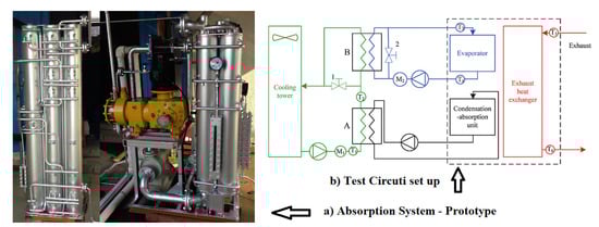 Du et al. [3] showed the development and experimental survey of an NH3/H2O absorption refrigeration prototype for reusing rejected heat from exhaust gases from diesel engines. The experimental results showed that the operation of the system was more reliable due to the increased variation of the exhaust gases, where a cooling capacity of 33.8 kW and a thermal COP of 0.53 were produced under the conditions of water, refrigerant and exhaust inlet were 26.1, −15.2, and 567 °C, respectively. This led to the approval of a new prototype configuration (Figure 4).