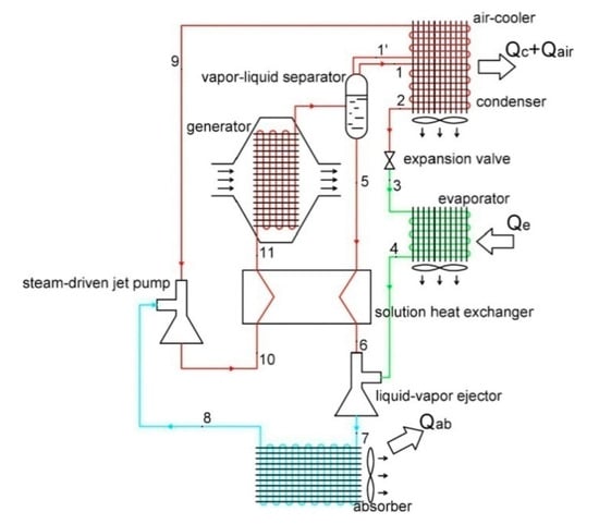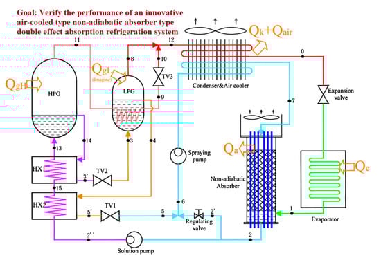 Comparing different solutions and introducing a new component to improve the thermal performance of absorption cooling systems, Cai et al. [65] conducted a thermodynamic study on a new air-cooled double-effect absorption cooling system (Figure 6).