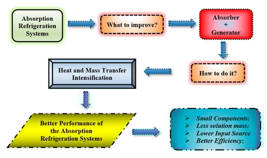 The intensification of mass and heat transfer processes in absorption systems represents the main goal of its optimal thermal behavior. That is why many authors have been investigating ways to enhance those processes [85,93,97]. Some possible improvements are the use of different working fluids, water added on the absorbent, configuration of the absorber, and generator, as seen in Figure 8 showing a flow chart on how and why the intensification on the heat and mass transfer has been so important to enhance the performance of the absorption refrigeration systems.