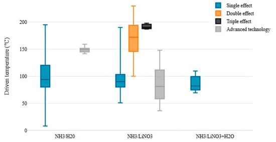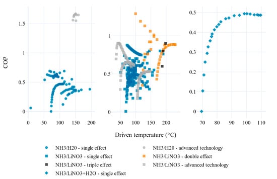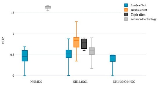 The increase of the multiple-effect absorption chiller leads to a better COP, as noted in studies such as [38,80]. That is why the authors have been keeping the study of such absorption systems using different working fluids. Hence, Domínguez-Inzunza et al. [81] performed a comparison of five configurations of absorption refrigeration systems in operation (half, single, double-effect in series, double and triple effect) with NH3/LiNO3. The lowest evaporator temperatures can be achieved with half effect systems at lower generator temperatures, with a COP around 0.3, and can also be used for air conditioning and industrial refrigeration. It was confirmed that the single-effect system is the simplest configuration compared to other systems, and the COP was almost twice as large as that obtained with half-effect systems, requiring, however, higher generator temperatures. With double-effect systems, it was possible to obtain a coefficient of performance as high as 1.12 in condenser temperatures of 30 °C, but they need generator temperatures higher than 140 °C to reach evaporator temperatures as low as 5 °C and presented high pressures. These systems can be used for air conditioning purposes. The highest COP can be achieved with triple-effect systems. However, they require the highest generator temperatures and the pressure is higher than the single- and double-effect systems, which could also increase the system cost. These types of equipment could be used for air conditioning.