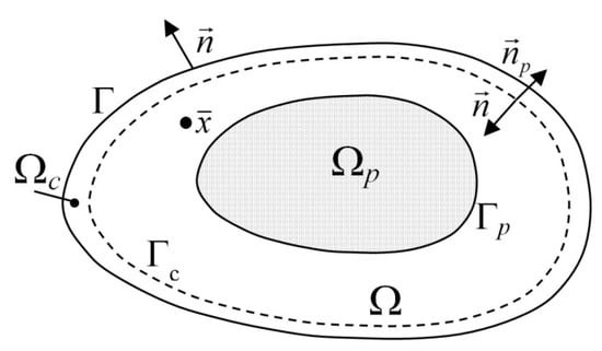- Function p—satisfying Equation (16) with the boundary condition (17) and the discontinuity condition on the surface Γc (18).