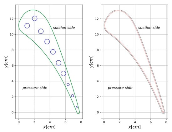 The algorithm considered in this paper is an expansion of the algorithm from the paper []. On the blade’s surface, a protective layer of a low value of the thermal conductivity coefficient was added. The desired constant value of temperature was assumed on the inner boundary, which separates the material of the blade from the protective layer. The material the blade is made of does not have contact with the external environment; therefore, the minimization functional (6) is defined on the inner boundary and not on the external boundary of the blade-like it is in the paper []. Application of an additional protective layer on the external boundary of the blade results in solving different differential equations in each step of the iteration than it is in the case of the algorithm discussed in paper [].