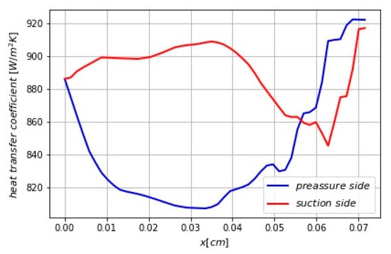 Distribution of the heat transfer coefficient on the blade’s external boundary.